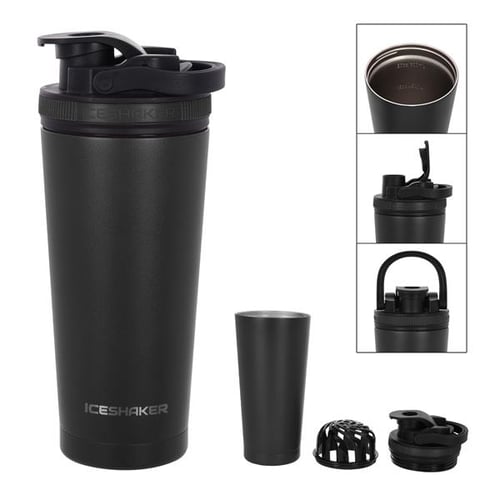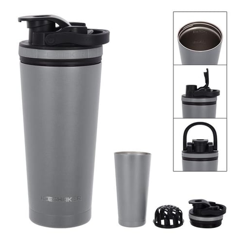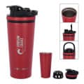 Boost your brand with this 26 oz. personalized stainless steel ice shaker bottle, as seen on Shark Tank with Rob Gronkowski. Designed for fitness and everyday use, this vacuum-insulated bottle keeps drinks hot or cold longer. It features a screw-on, spill-resistant flip-top lid, internal measurement markings, and a removable agitator to break up powders and strain ice. The easy-carry handle makes it perfect for on-the-go hydration. Customize it with your logo for a unique promotional gift. BPA-free and FDA-compliant, this branded shaker is a must-have for active lifestyles.