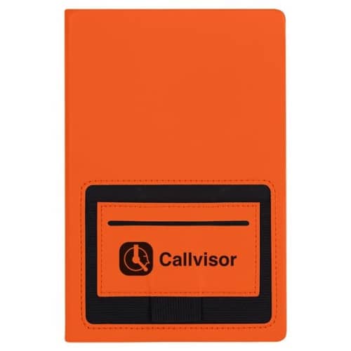 80 Page Lined Notebook. Front Cover Features 4 5/8" W x 4 1/2" H Phone Pocket, Business Card Holder And Pen Loop. Polyurethane Cover.